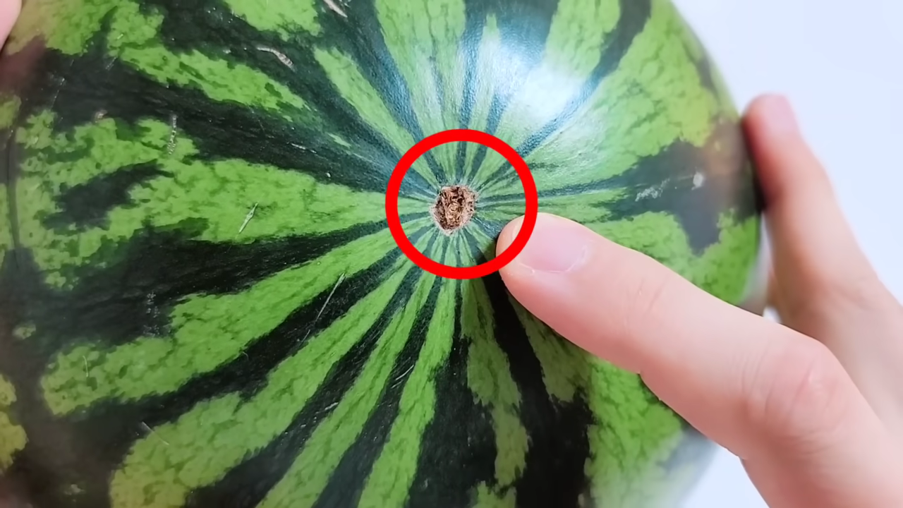 먼저, 수박 아래쪽에 있는 배꼽을 보세요. 배꼽이 작을수록 당도가 높은 수박일 가능성이 높습니다. 배꼽이 작다는 것은 수박 꽃이 떨어진 다음 낙하 부위가 잘 아물어서 닭을 생장할 때 문제 없이 잘 컸다는 뜻입니다.